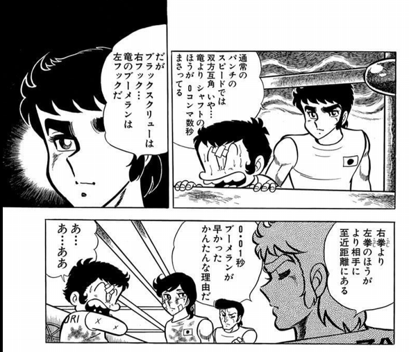剣崎戦ではホワイティが数十メートル宙に舞い上がっていて、そろそろ超人ボクシングの香りを見せ始めていますが、すぐ後の竜児VSシャフトで「左フックであるブーメランフックの方が右フックのブラックスクリューよりわずかながら早かった」という正統派ボクシング「ぽい」解説があって、一気に超人モノへと持って行かないわけです。このあたりの手口(?)は非常に巧妙ですねw